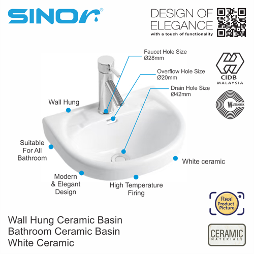 Sinor BS-301 Wall Hung Ceramic Basin Bathroom Ceramic Basin