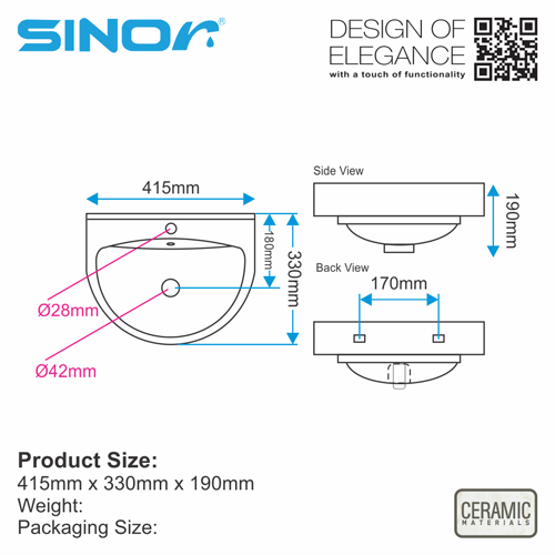 Introducing our wall-hung ceramic basin, a space-saving marvel that combines functionality with contemporary design. Crafted from premium ceramic, it offers durability and a sleek aesthetic. The wall-hung installation not only maximizes floor space but also creates a clean, modern look. With a versatile white finish, this basin effortlessly complements various bathroom styles. Upgrade your bathroom with this innovative solution that harmonizes practicality and style, redefining your space with a touch of sophistication.