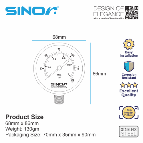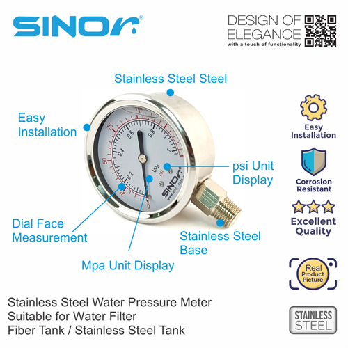 Sinor WFA-WPM-68 Stainless Steel Water Pressure Meter Suitable For Sand Filter